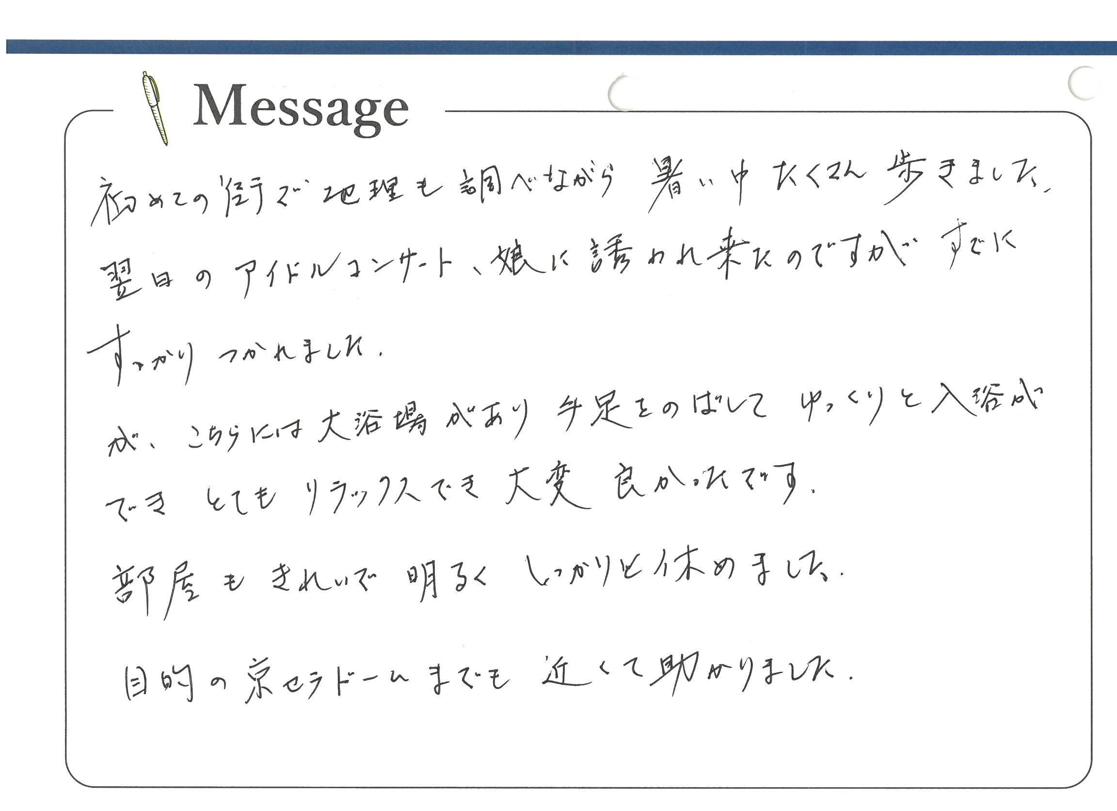 初めての街で地理も調べながら暑い中たくさん歩きました。翌日のアイドルコンサート、娘に誘われ来たのですがすでにすっかりつかれました。が、こちらには大浴場があり手足をのばしてゆっくりと入浴ができ、とてもリラックスでき大変良かったです。部屋もきれいで明るくしっかりと休めました。目的の京セラドームまでも近くて助かりました。