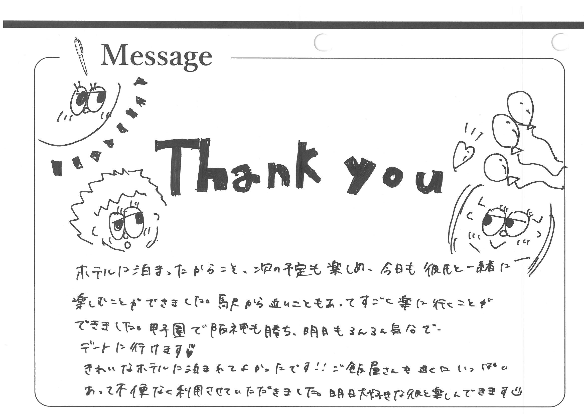 Thank you!ホテルに泊まったからこそ、次の予定も楽しめ、今日も彼氏と一緒に楽しむことができました。駅から近いこともあってすごく楽に行くことができました。甲子園で阪神も勝ち、明日もるんるん気分でデートに行けます。きれいなホテルに泊まれてよかったです!!ご飯屋さんも近くにいっぱいあって不便なく利用させていただきました。明日大好きな彼と楽しんできます。