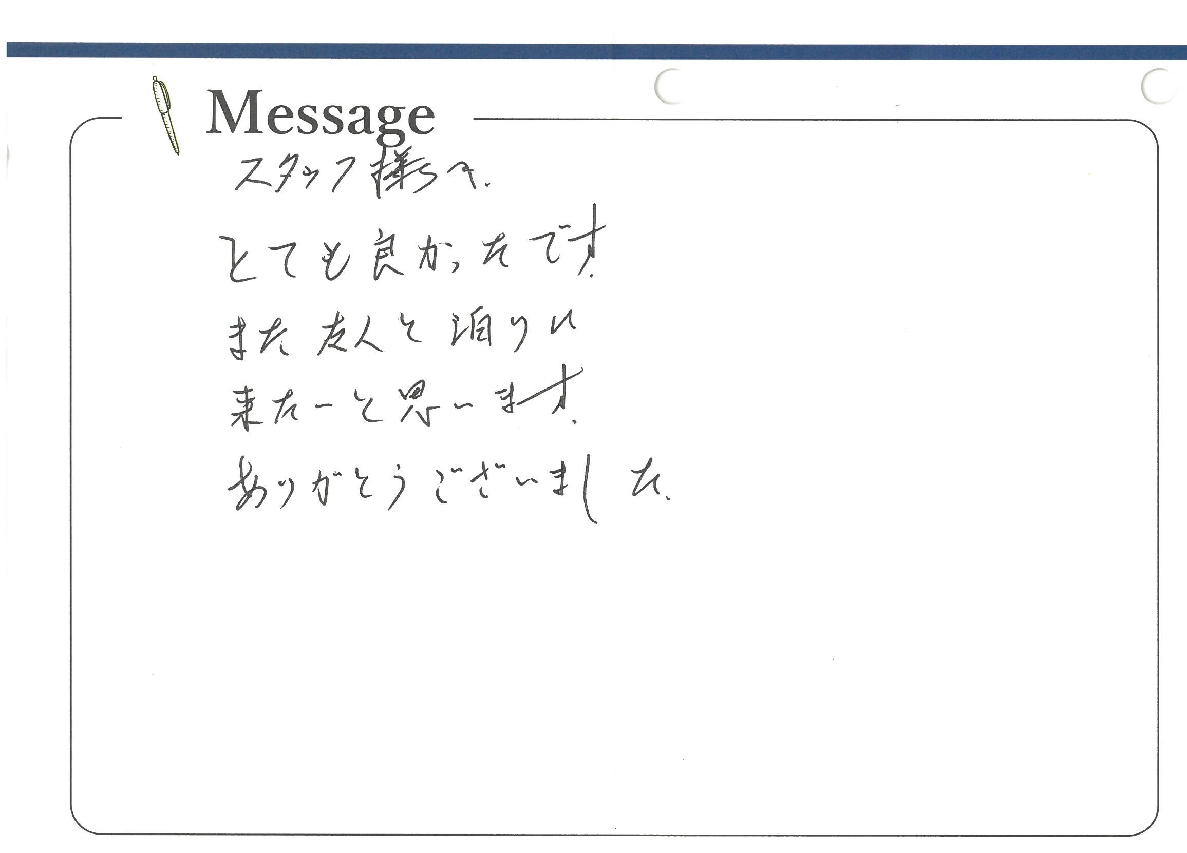 スタッフ様へ、とても良かったですまた友人と泊りに来たいと思います。ありがとうございました。
