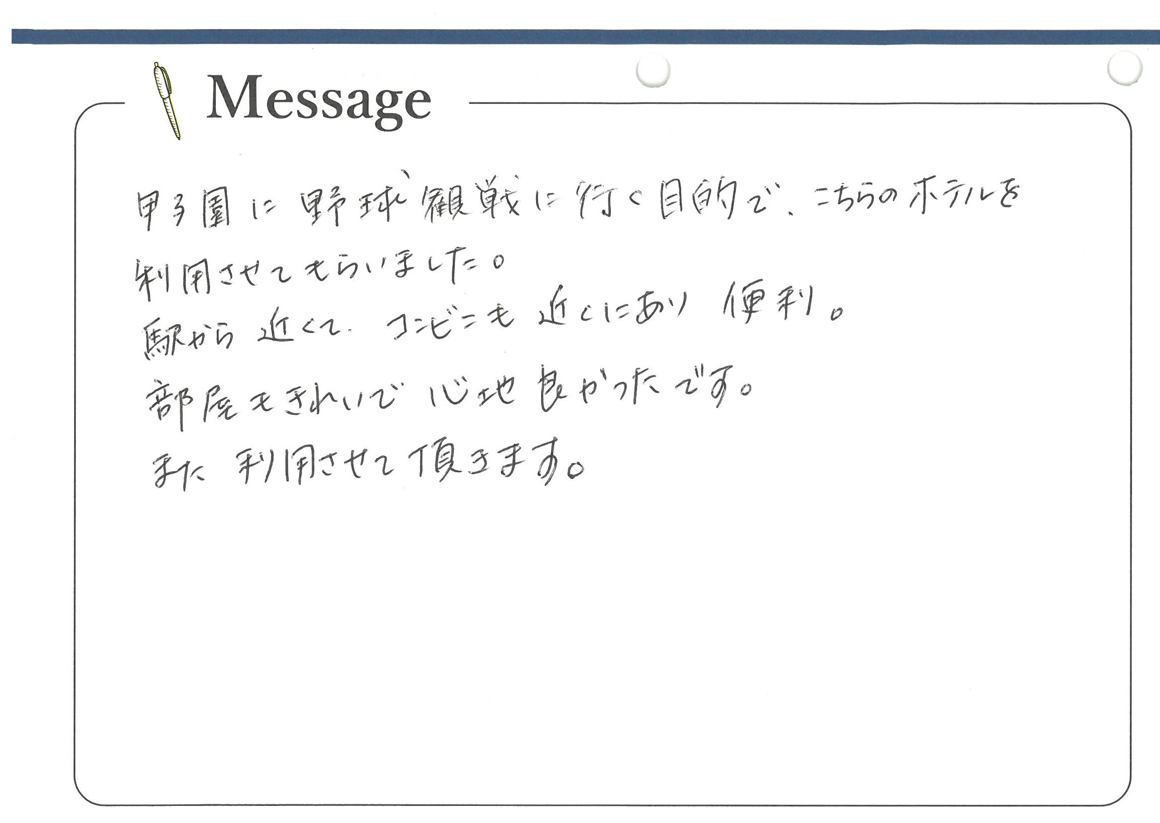 甲子園に野球観戦に行く目的で、こちらのホテルを利用させてもらいました。駅から近くて、コンビニも近くにあり便利。部屋もきれいで心地良かったです。また利用させて頂きます。