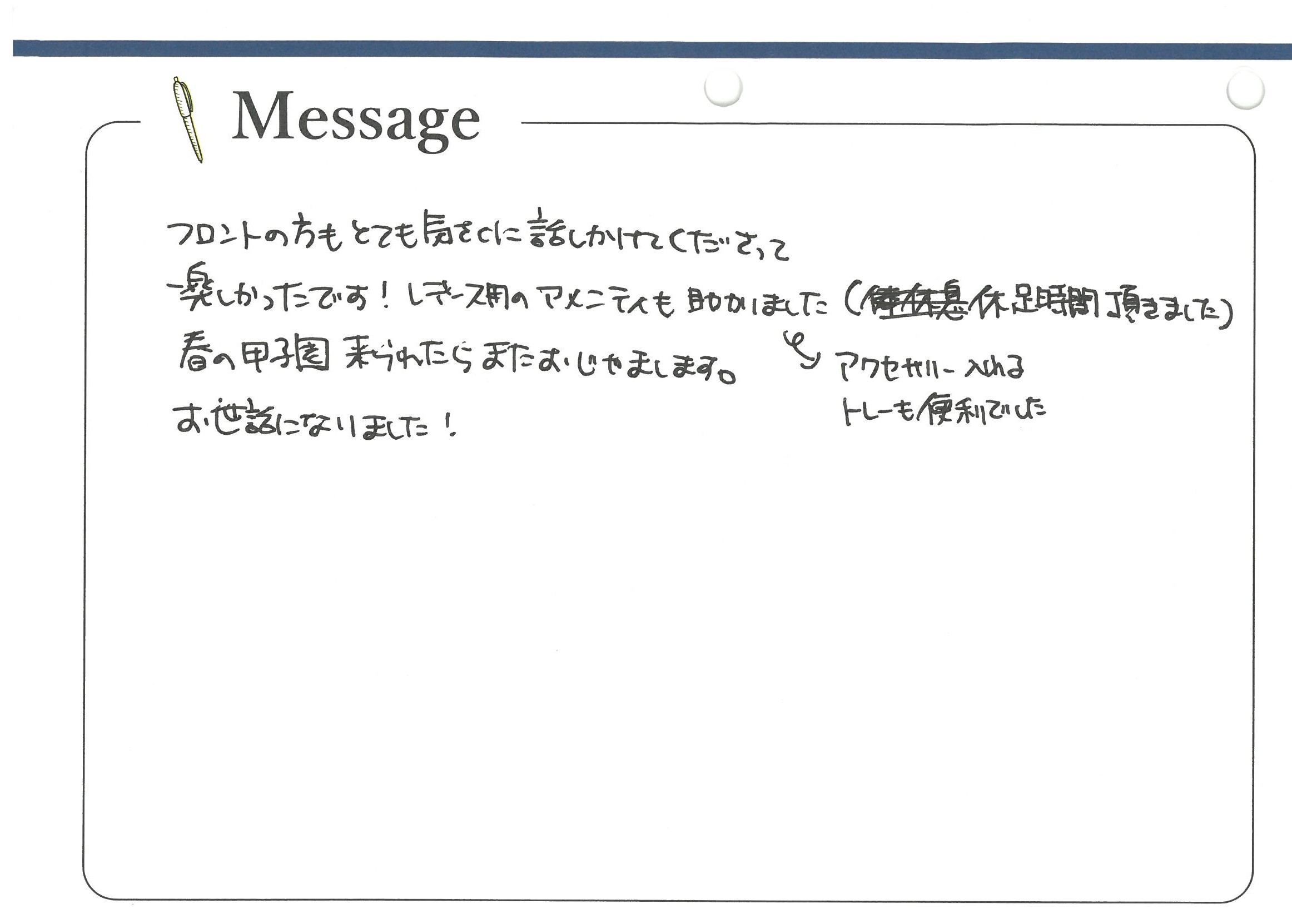 フロントの方もとても気さくに話しかけてくださって楽しかったです!レディース用のアメニティも助かりました。アクセサリー入れるトレーも便利でした。(休足時間頂きました)春の甲子園来られたらまたおじゃまします。お世話になりました!