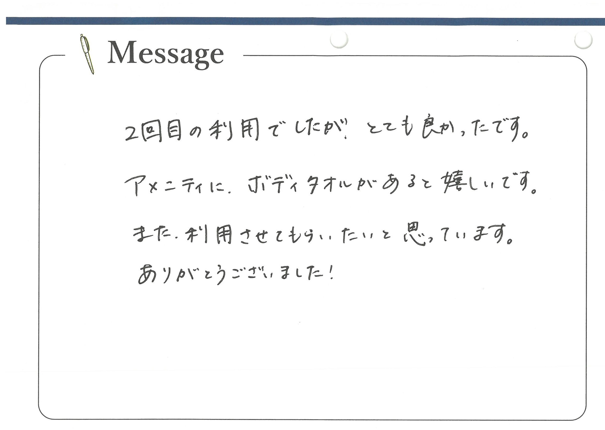 2回目の利用でしたが、とても良かったです。アメニティに、ボディタオルがあると嬉しいです。また利用させてもらいたいと思っています。ありがとうございました!