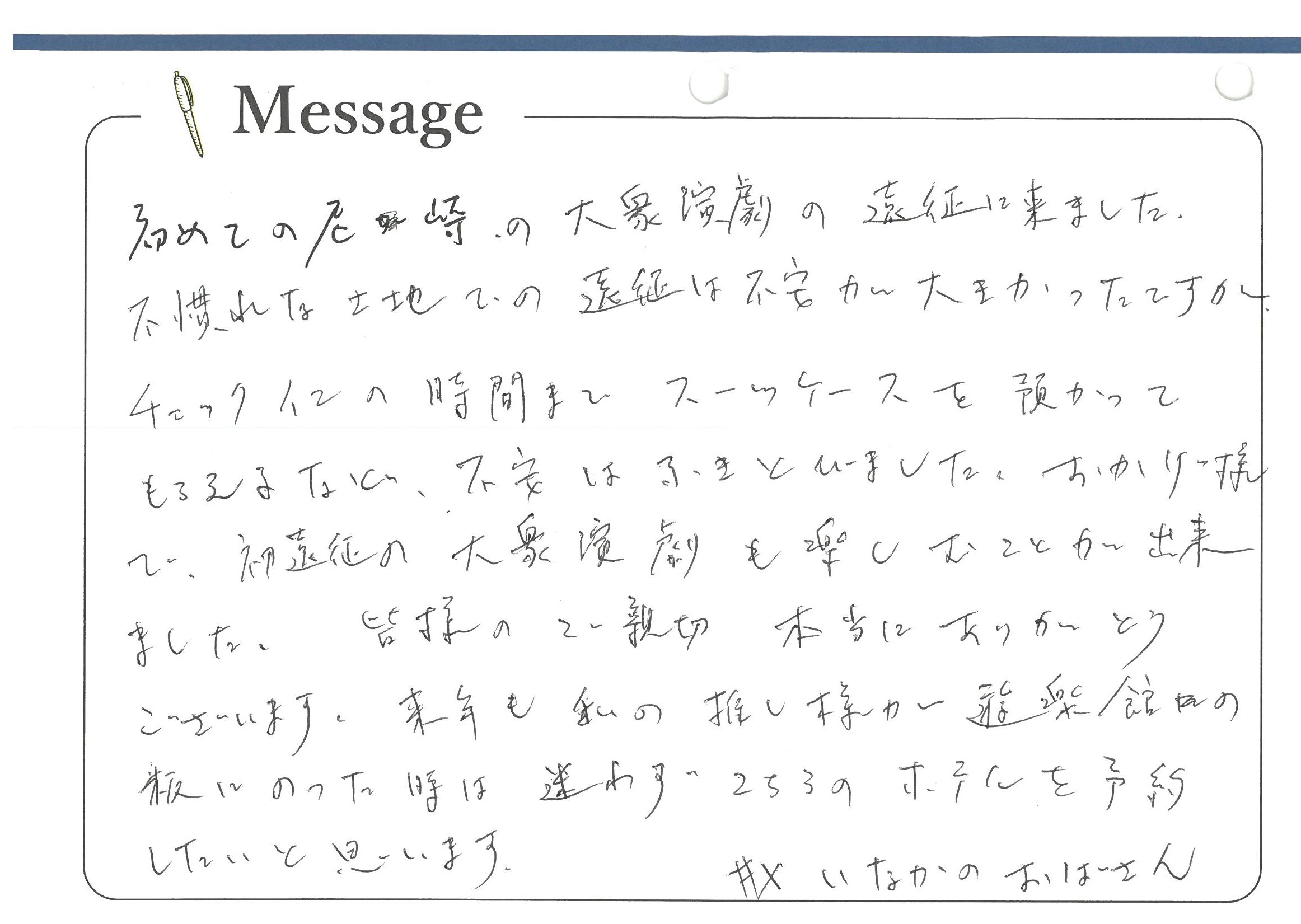 初めての尼崎の大衆演劇の遠征に来ました。不慣れな土地での遠征は不安が大きかったですが、チェックインの時間までスーツケースを預かってもらえるなど、不安はふきとびました。おかげ様で、初遠征の大衆演劇も楽しむことが出来ました。皆様のご親切本当にありがとうございます。来年も私の推し様が遊楽館の板にのった時は迷わずこちらのホテルを予約したいと思います。