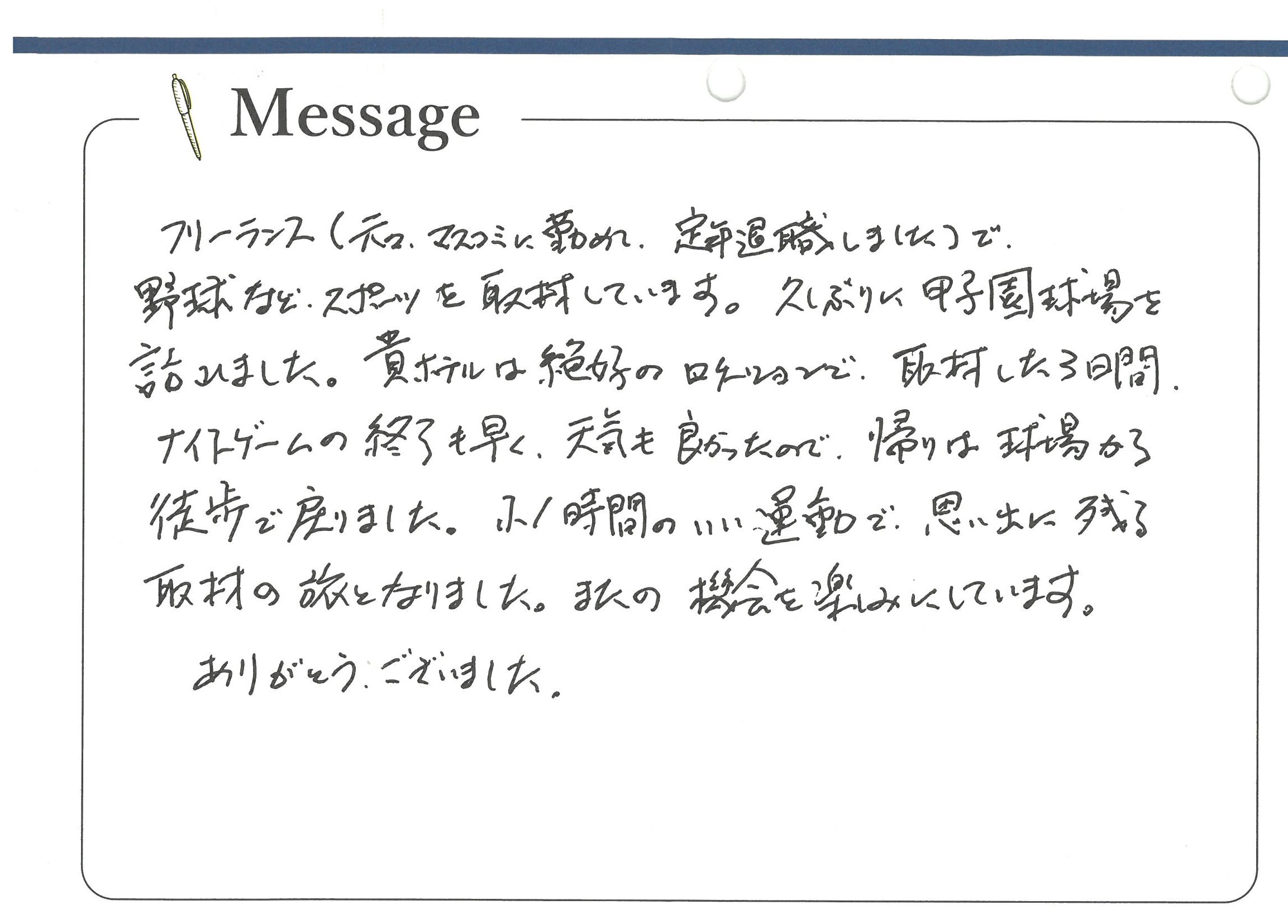 フリーランス(元々、マスコミに勤めて、定年退職しました)で野球などスポーツを取材しています。久しぶりに甲子園球場を訪れました。貴ホテルは絶好のロケーションで、取材した3日間ナイトゲームの終了も早く天気も良かったので、帰りは球場から徒歩で戻りました。小1時間のいい運動で思い出に残る取材の旅となりました。またの機会を楽しみにしています。ありがとうございました。