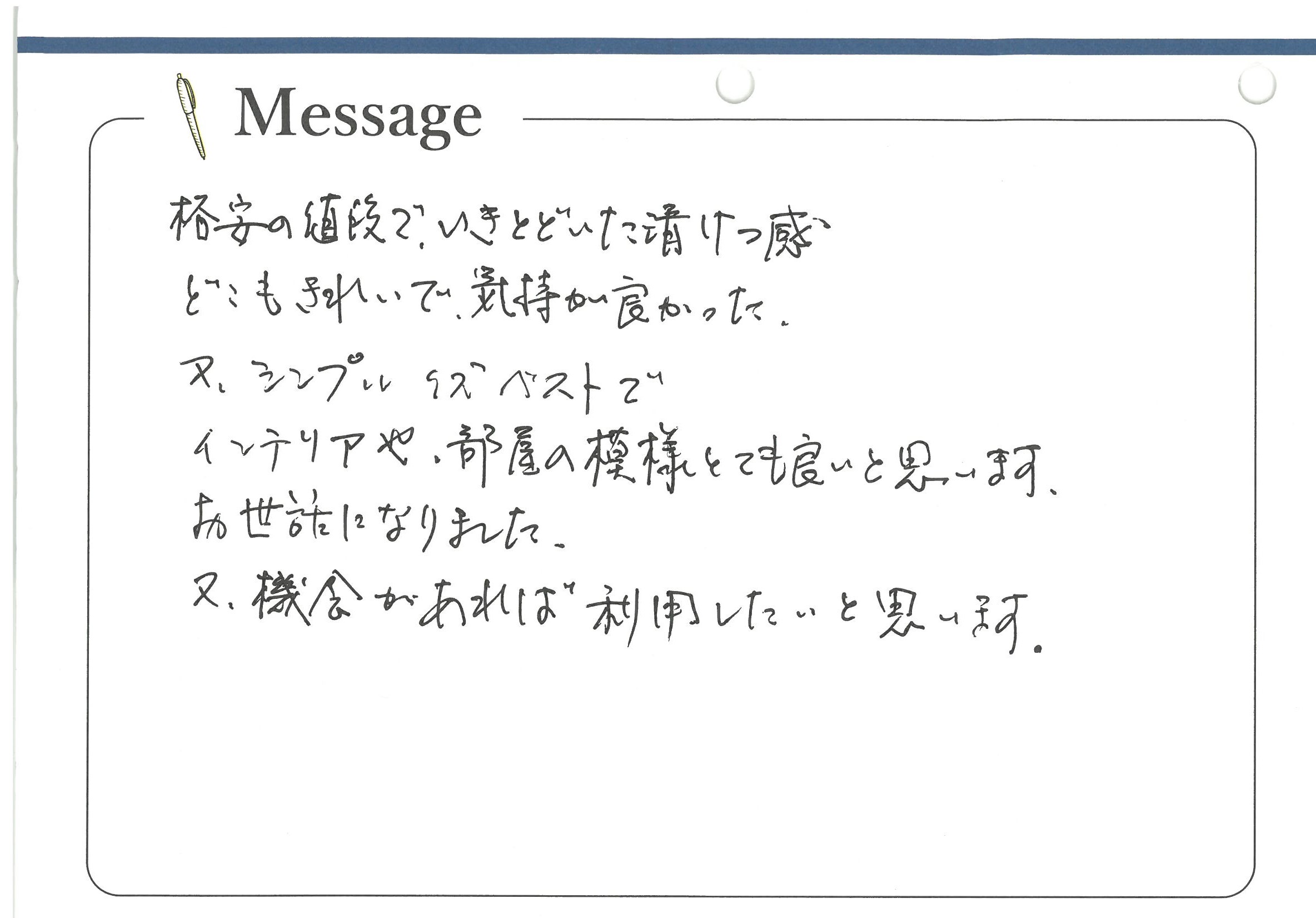 格安の値段で、いきとどいた清けつ感。どこもきれいで気持が良かった。又、シンプルイズベストでインテリアや、部屋の模様とても良いと思います。お世話になりました。又、機会があれば利用したいと思います。