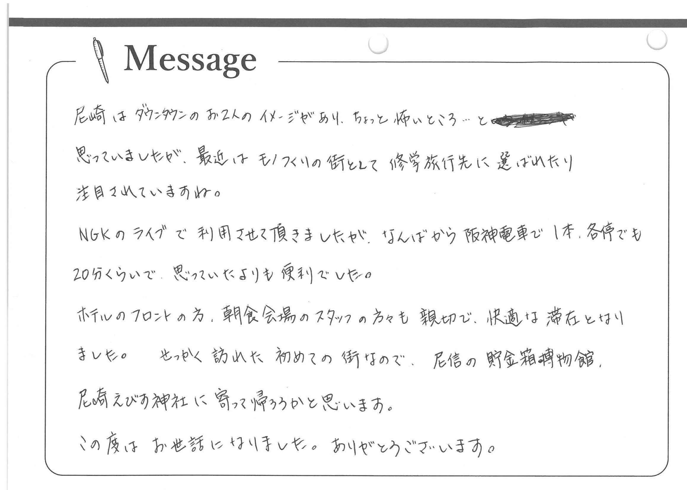 尼崎はダウンタウンのお2人のイメージがありちょっと怖いところ・・・と思っていましたが、最近はモノつくりの街として修学旅行先に選ばれたり注目されていますね。NGKのライブで利用させて頂きましたが、なんばから阪神電車で1本、各停でも20分くらいで思っていたよりも便利でした。ホテルのフロントの方、朝食会場のスタッフの方々も親切で快適な滞在となりました。せっかく訪れた初めての街なので、尼信の貯金箱博物館、尼崎えびす神社に寄って帰ろうかと思います。この度はお世話になりました。ありがとうございます。