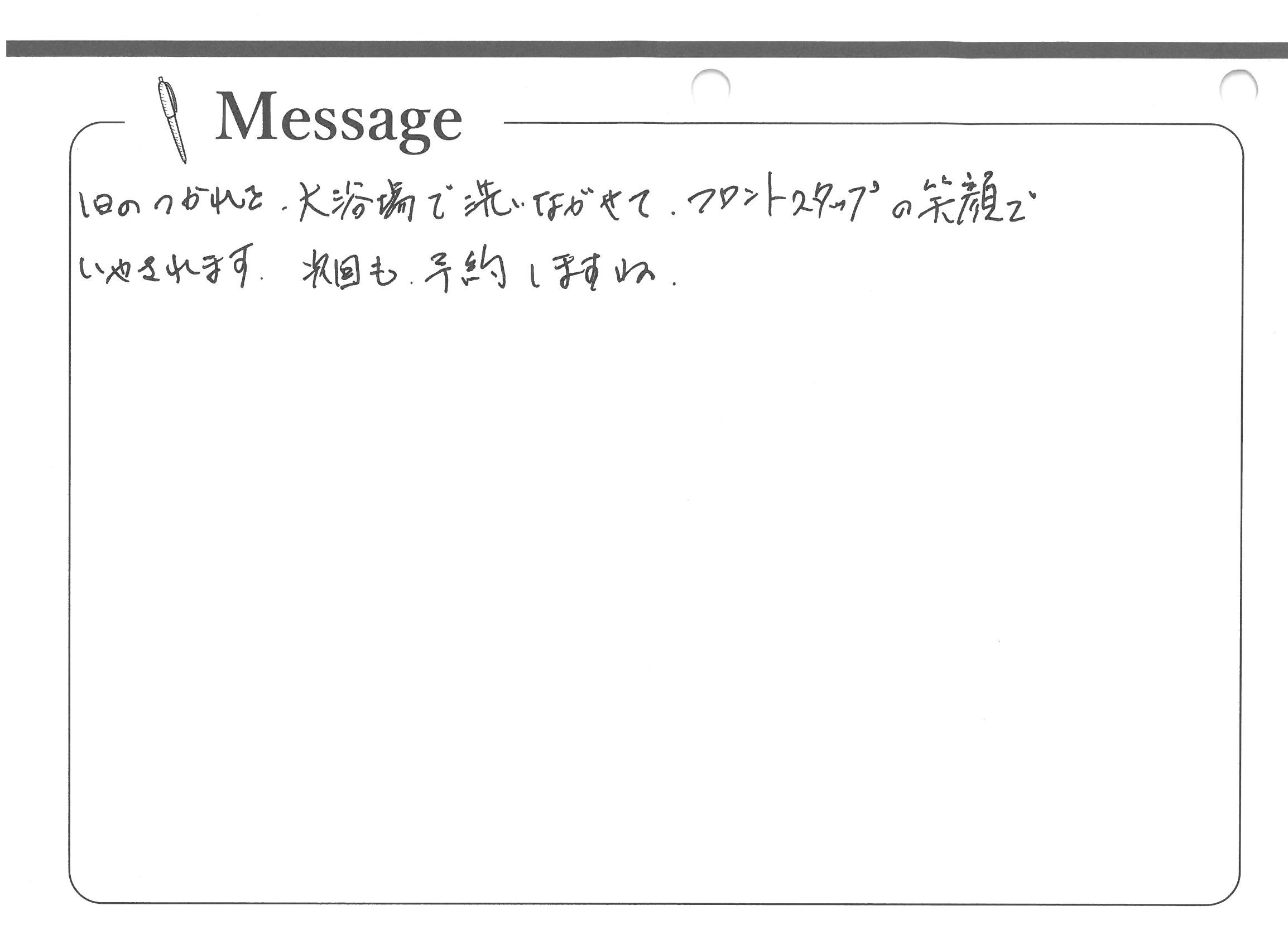 1日のつかれを、大浴場でながせて、フロントスタッフの笑顔でいやされます。次回も予約しますね。