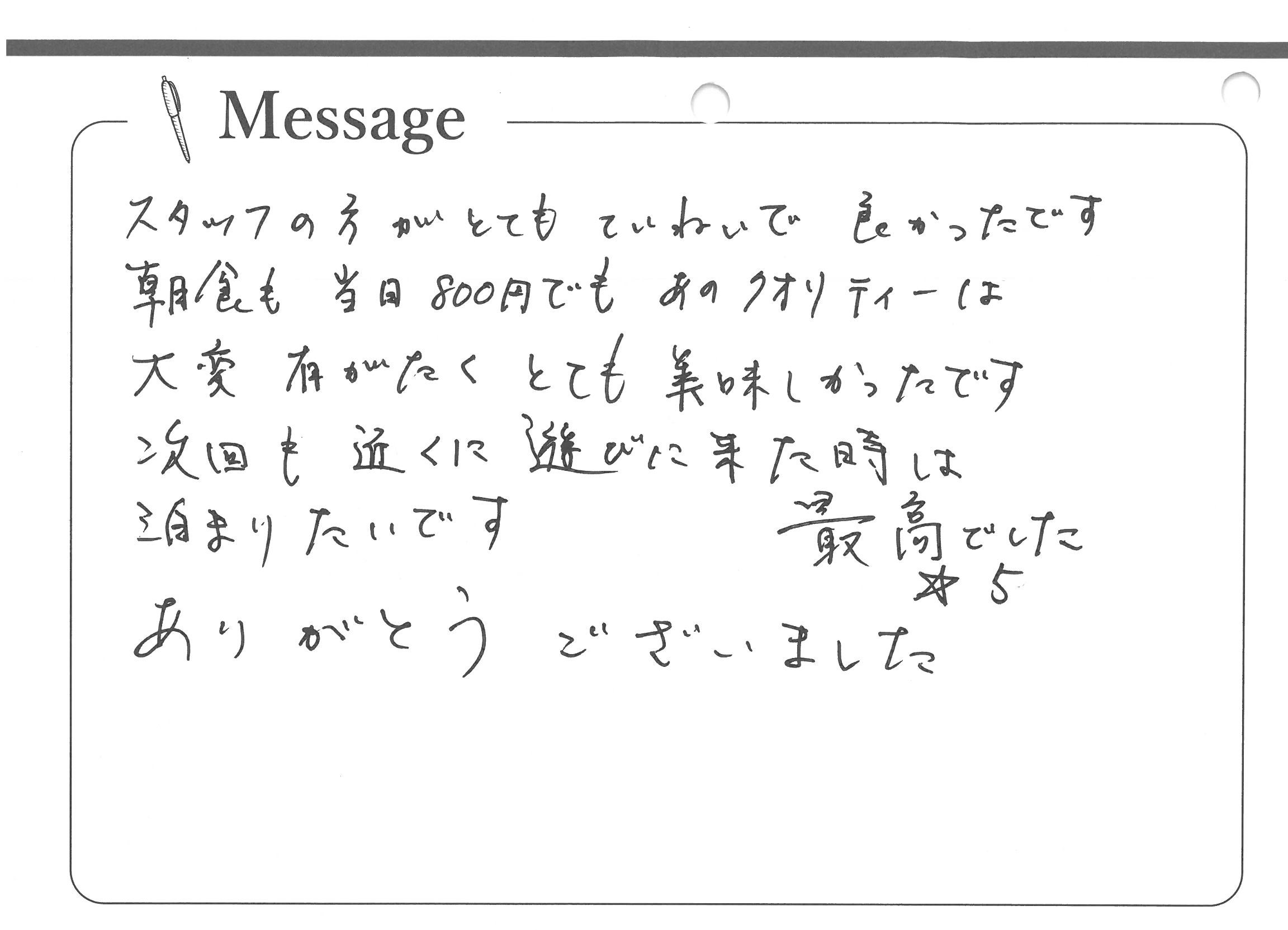 スタッフの方がとてもていねいで良かったです。朝食も当日800円でもあのクオリティーは大変有がたくとても美味しかったです。次回も近くに遊びに来た時は泊まりたいです。最高でした☆5。ありがとうございました。