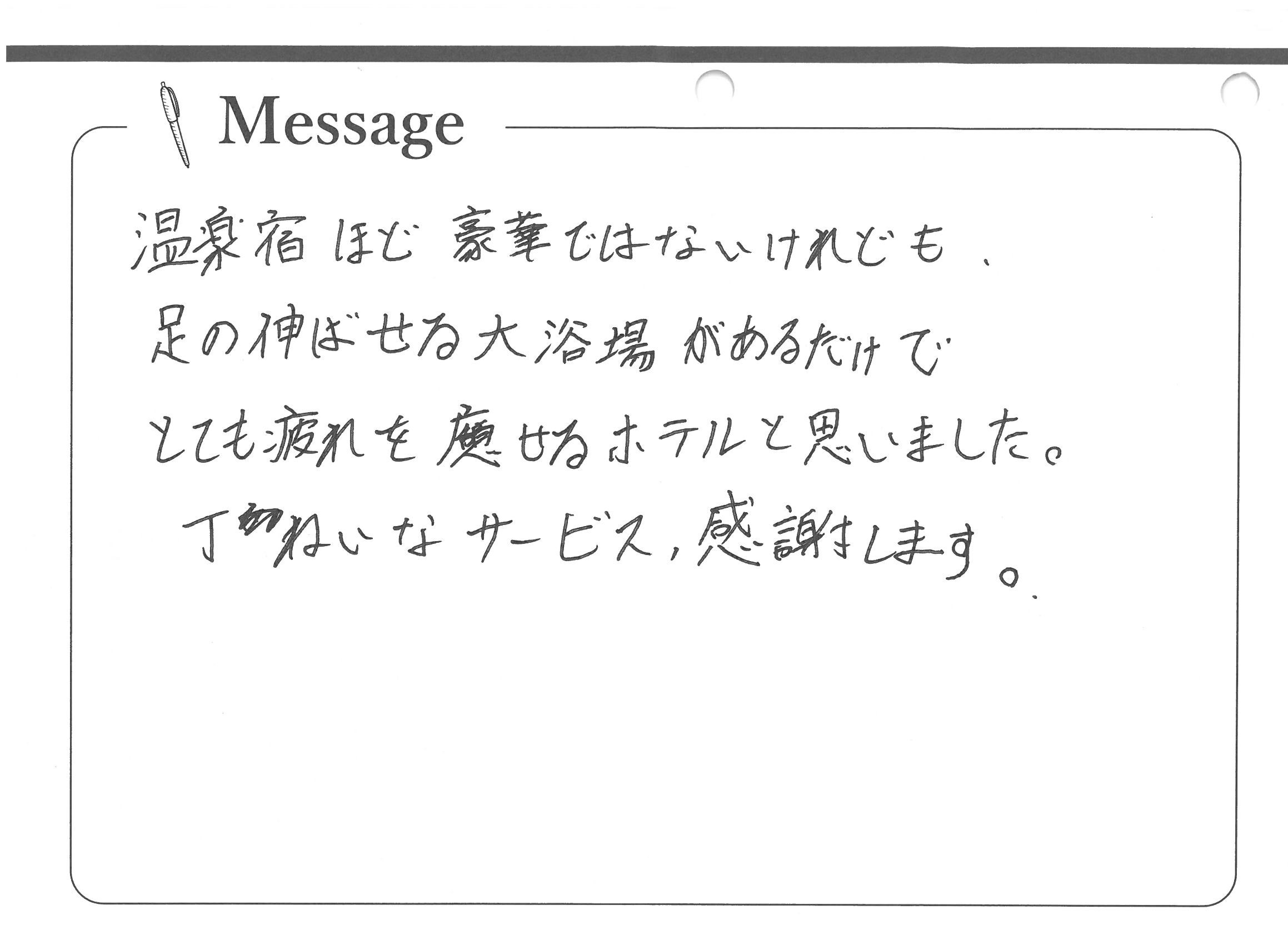 温泉宿ほど豪華ではないけれども、足の伸ばせる大浴場があるだけでとても疲れを癒せるホテルと思いました。丁ねいなサービス感謝します。