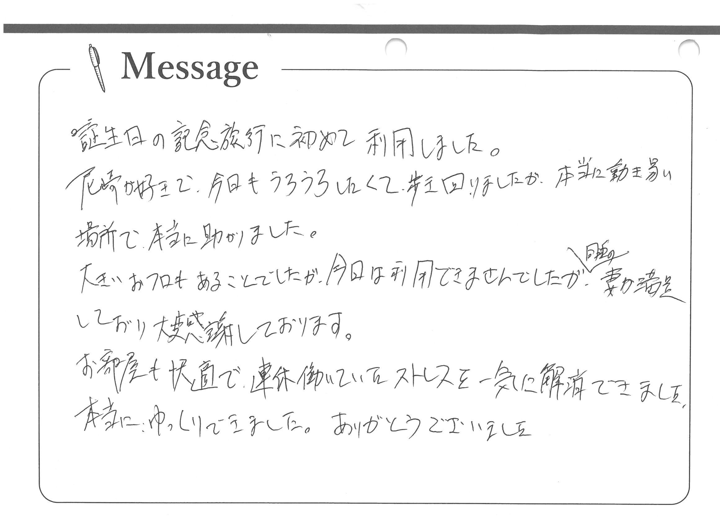 誕生日の記念旅行に初めて利用しました。尼崎が好きで、今回もうろうろしたくて歩き回りましたが、本当に動き易い場所で本当に助かりました。大きいおフロもあることでしたが、今回は利用できませんでしたが、同泊の妻が満足しており大変感謝しております。お部屋も快適で連休働いていたストレスを一気に解消できました。本当にゆっくりできました。ありがとうございました。