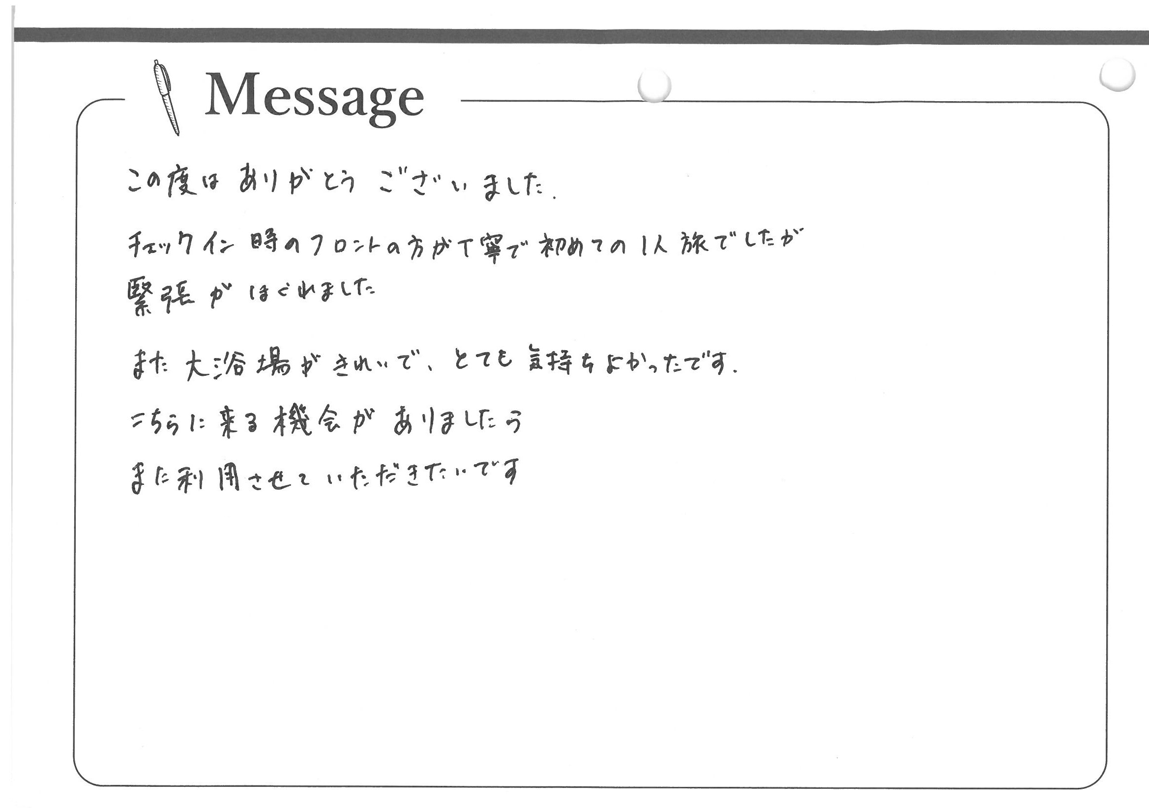 この度はありがとうございました。チェックインの時のフロントの方が丁寧で初めての1人旅でしたが緊張がほぐれました。また大浴場がきれいで、とても気持ちよかったです。こちらに来る機会がありましたらまた利用させていただきたいです。