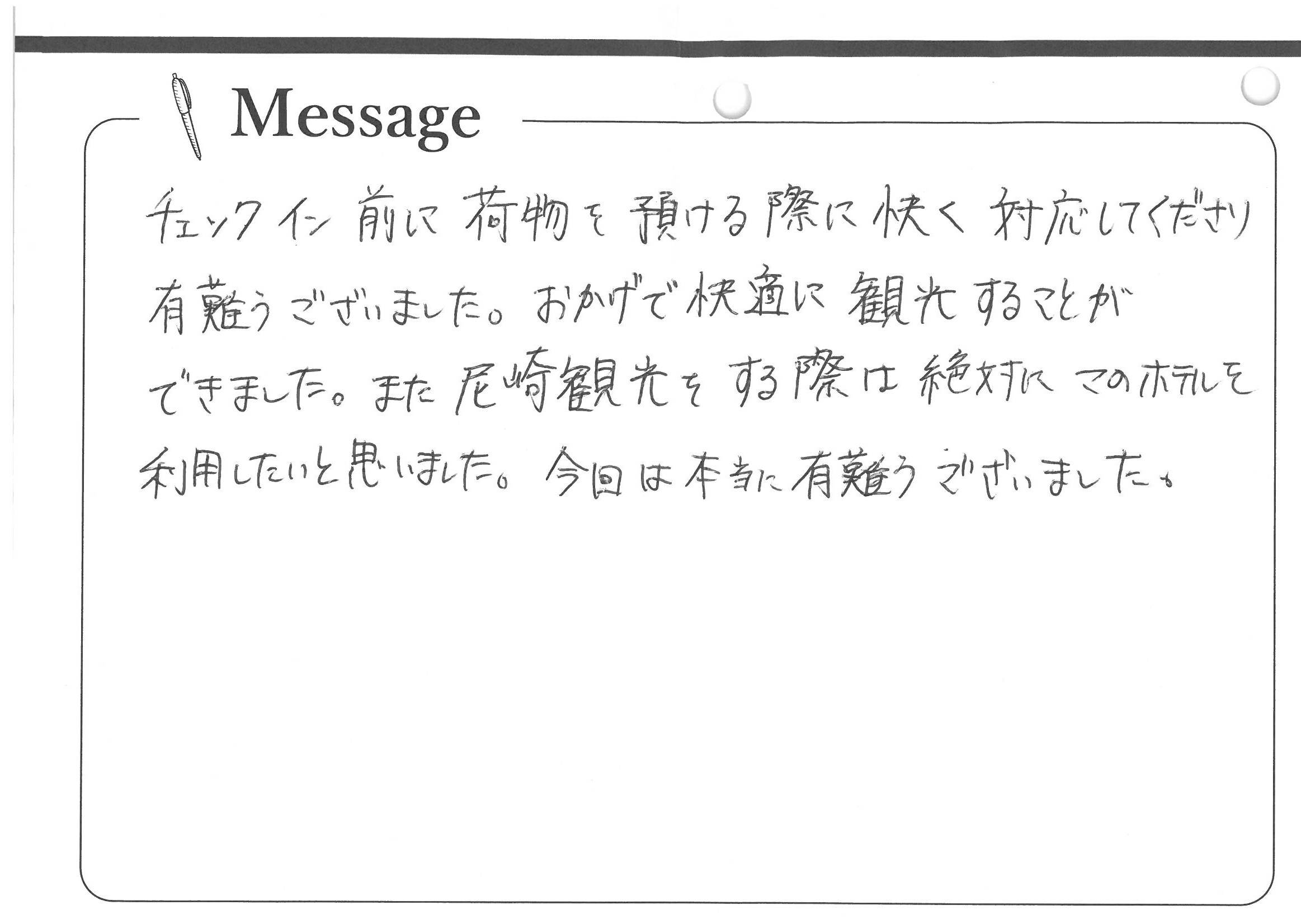 チェックイン前に荷物を預ける際に快く対応くださり有難うございました。おかげで快適に観光することができました。また尼崎観光をする際は絶対にこのホテルを利用したいと思いました。今回は本当に有難うございました。