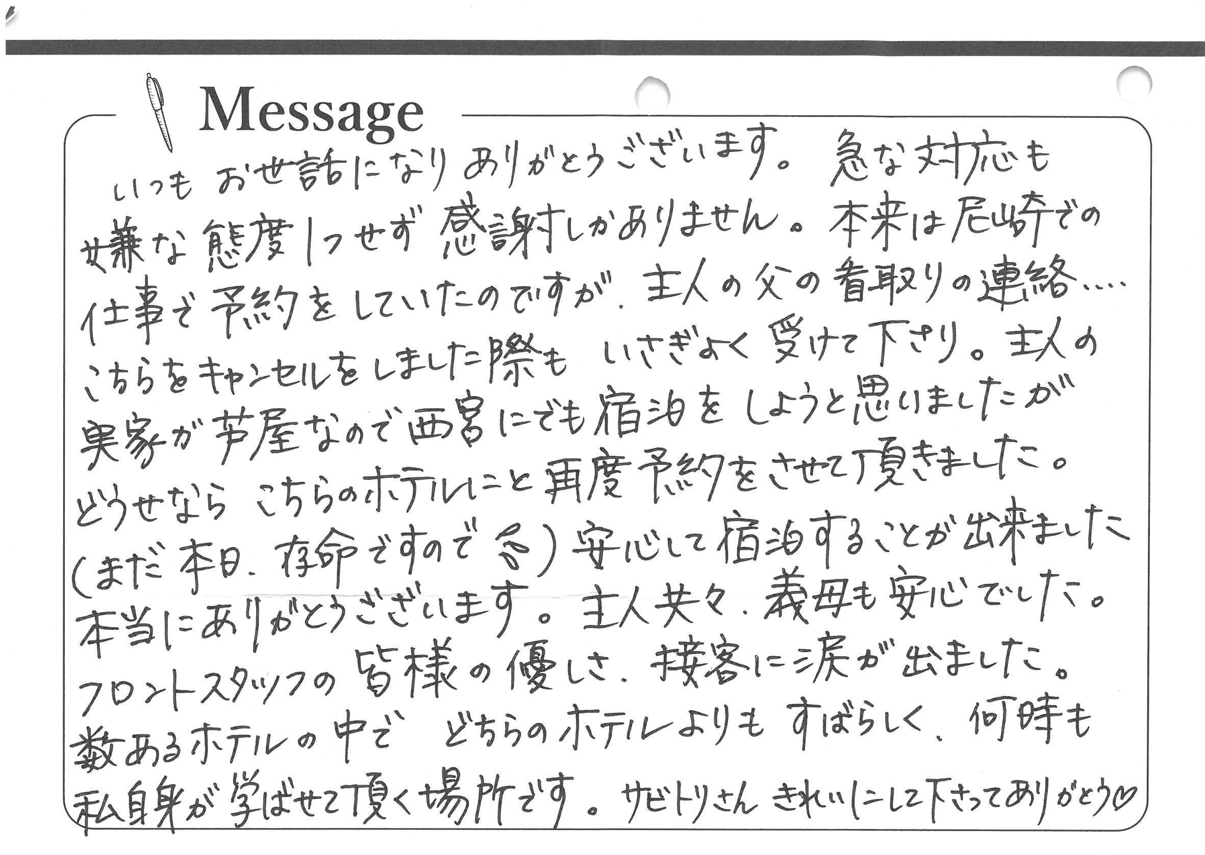 いつもお世話になりありがとうございます。急な対応も嫌な態度1つせず感謝しかありません。本来は尼崎での仕事で予約をしていたのですが、主人の父の看取りの連絡・・・。こちらをキャンセルをしました際もいさぎよく受けて下さり。主人の実家が芦屋なので西宮にでも宿泊しようと思いましたがどうせならこちらのホテルにと再度予約をさせて頂きました。(まだ本日、存命ですので)安心して宿泊することが出来ました。本当にありがとうございます。主人共々、義母も安心でした。フロントスタッフの皆様の優しさ、接客に涙が出ました。数あるホテルの中でどちらのホテルよりもすばらしく、何時も私自身が学ばせて頂く場所です。