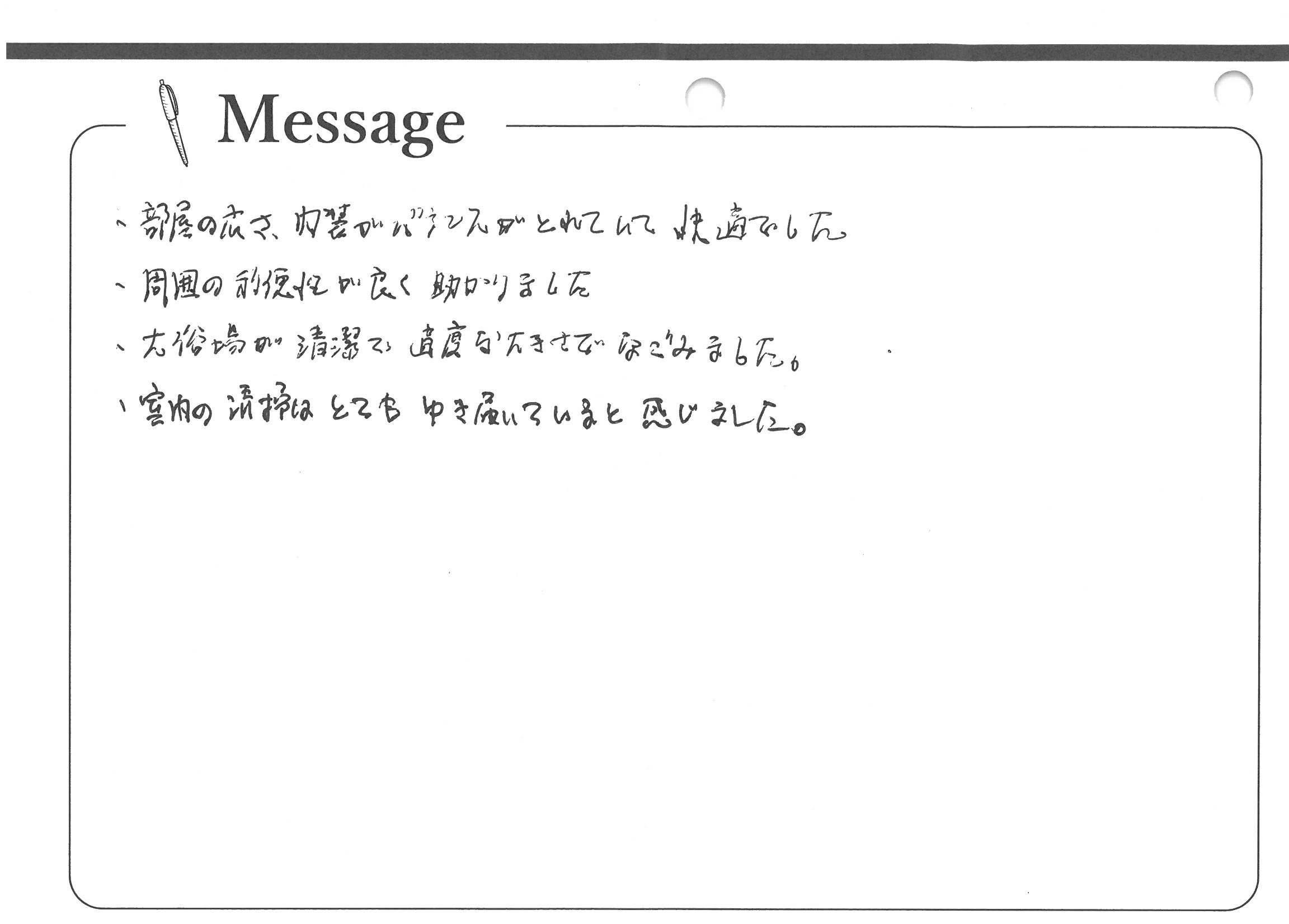部屋の広さ、内装がバランスがとれていて快適でした。周囲の利便性が良く助かりました。大浴場が清潔で適度な大きさでなごみました。室内の清掃はとてもゆき届いていると感じました。
