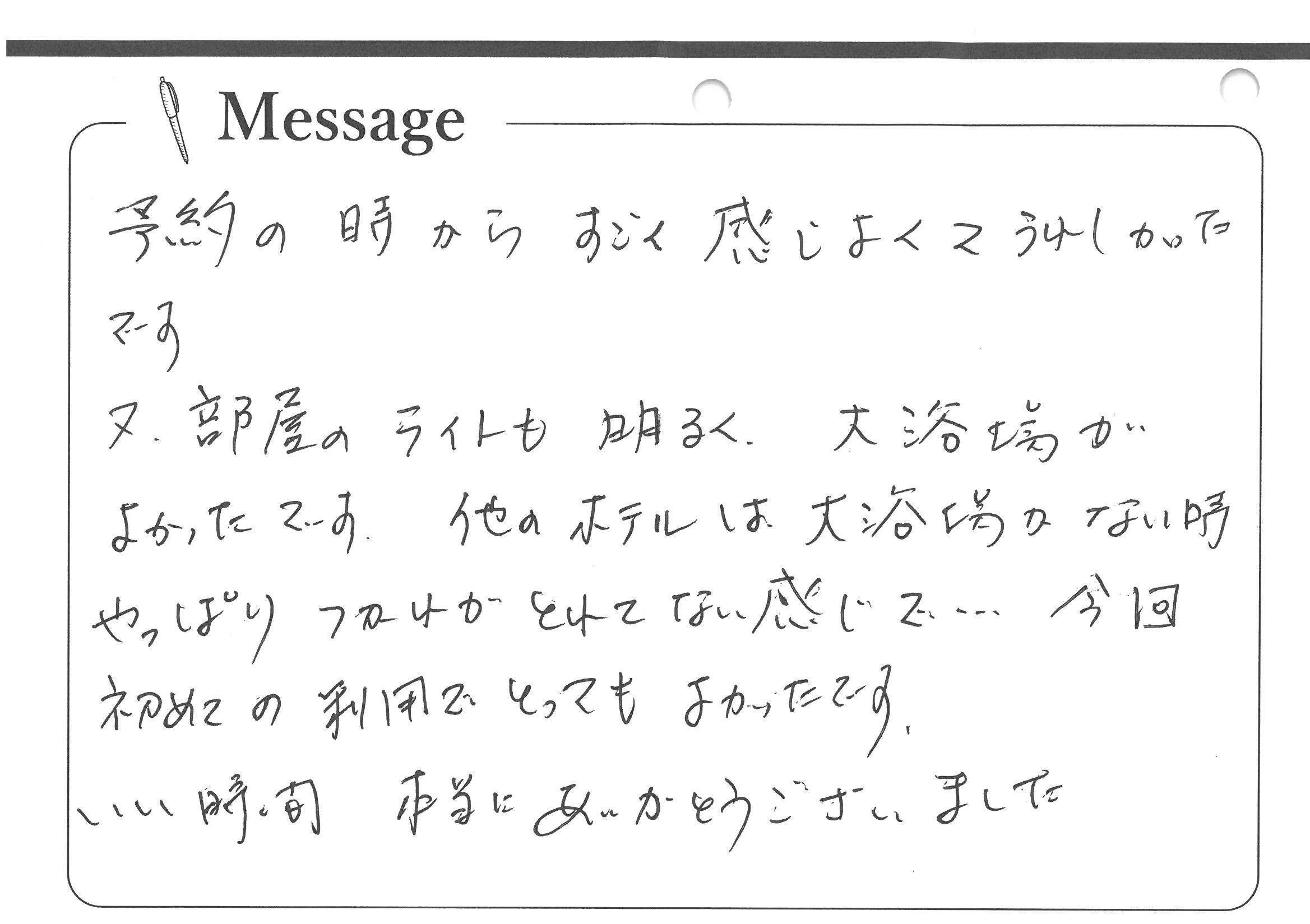 予約の時からすごく感じよくてうれしかったです。又、部屋のライトも明るく、大浴場がよかったです。他のホテルは大浴場がない時やっぱりつかれがとれてない感じで・・・。今回初めての利用でとってもよかったです。いい時間、本当にありがとうございました。