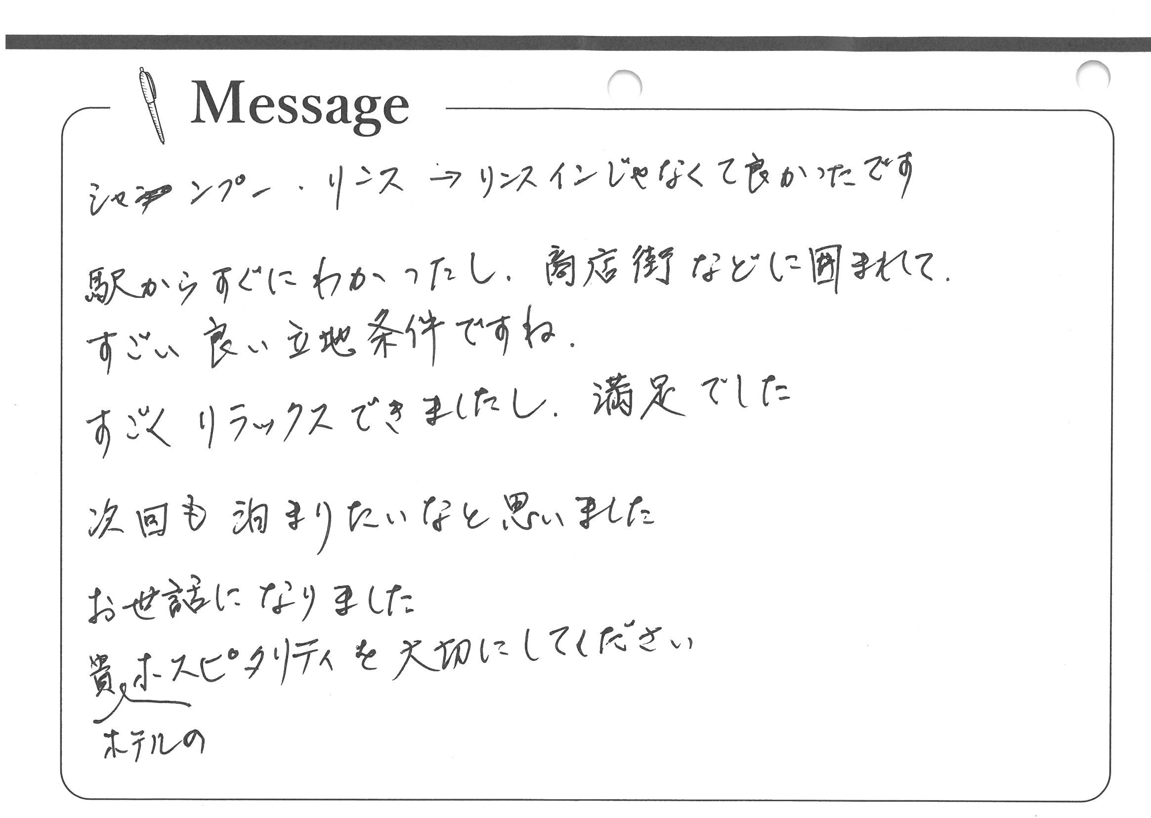 シャンプー・リンス→リンスインじゃなくて良かったです。駅からすぐわかったし、商店街などに囲まれてすごい良い立地条件ですね。すごくリラックスできましたし、満足でした。次回も泊まりたいなと思いました。お世話になりました。貴ホテルのホスピタリティを大切にしてください。