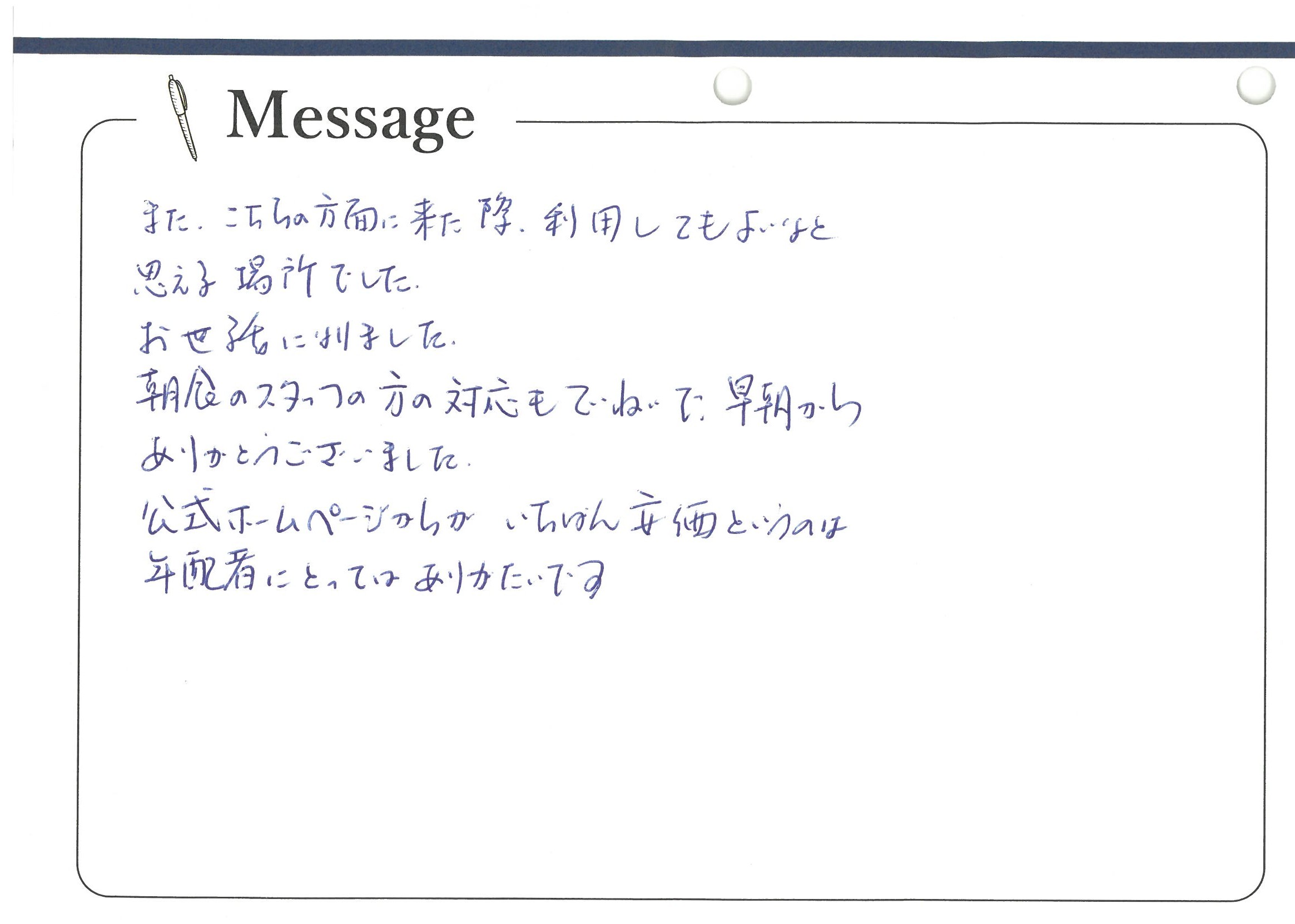 また、こちらの方面に来た際、利用してもよいなと思える場所でした。お世話になりました。朝食のスタッフの方の対応もていねいで、早朝からありがとうございました。公式ホームページからがいちばん安価というのは年配者にとってはありがたいです。