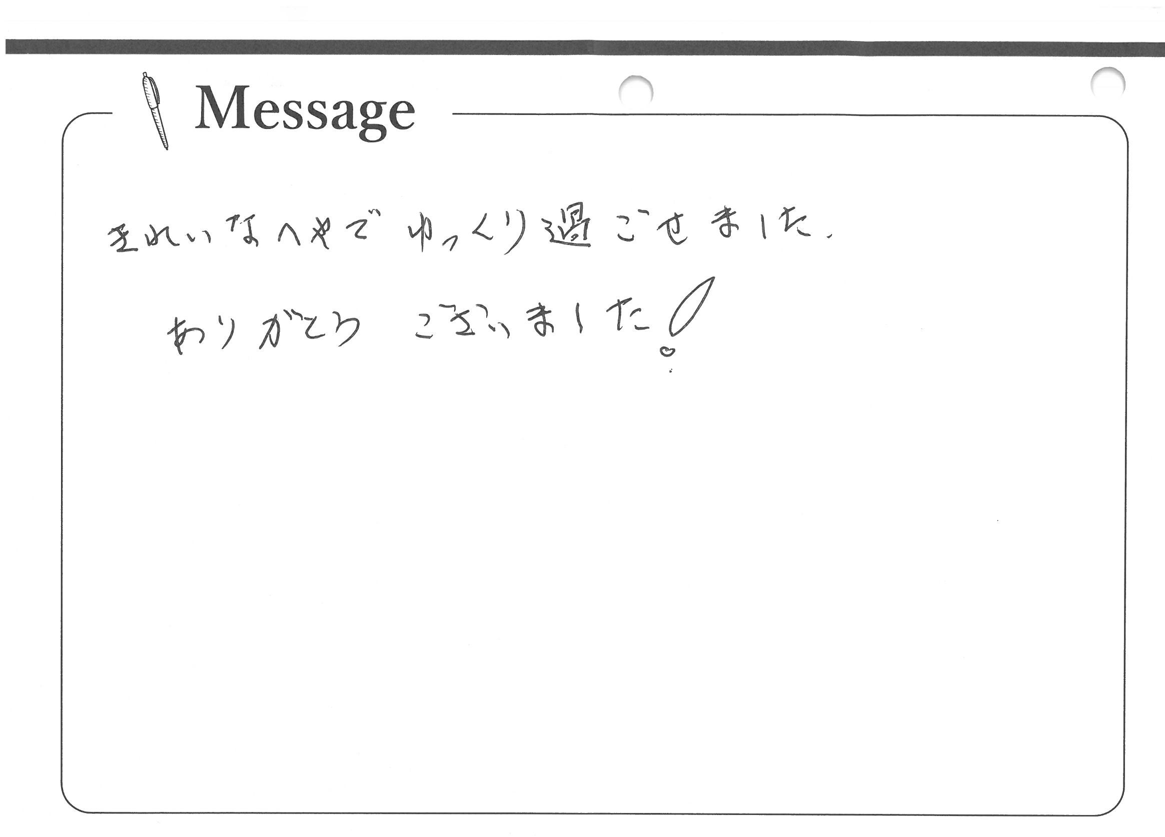 きれいなへやでゆっくり過ごせました。ありがとうございました!