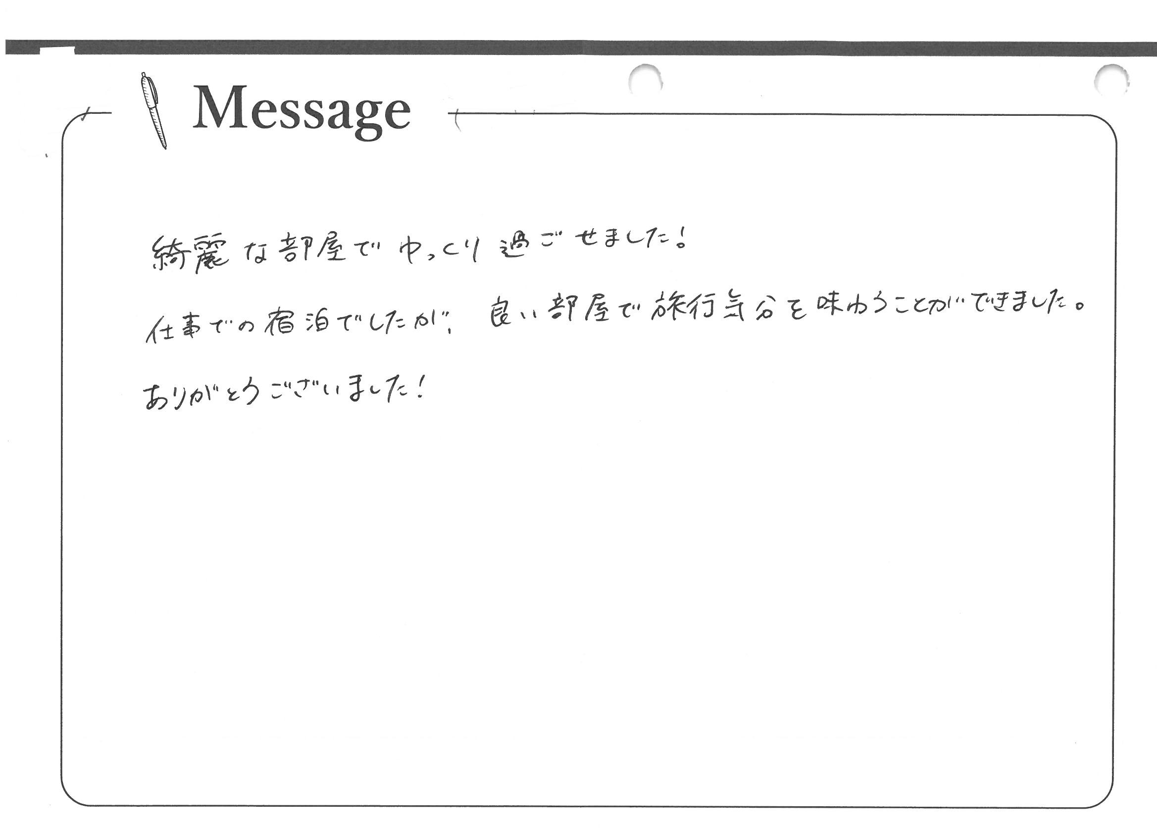 綺麗な部屋でゆっくり過ごせました!仕事での宿泊でしたが、良い部屋で旅行気分を味わうことができました。ありがとうございました!