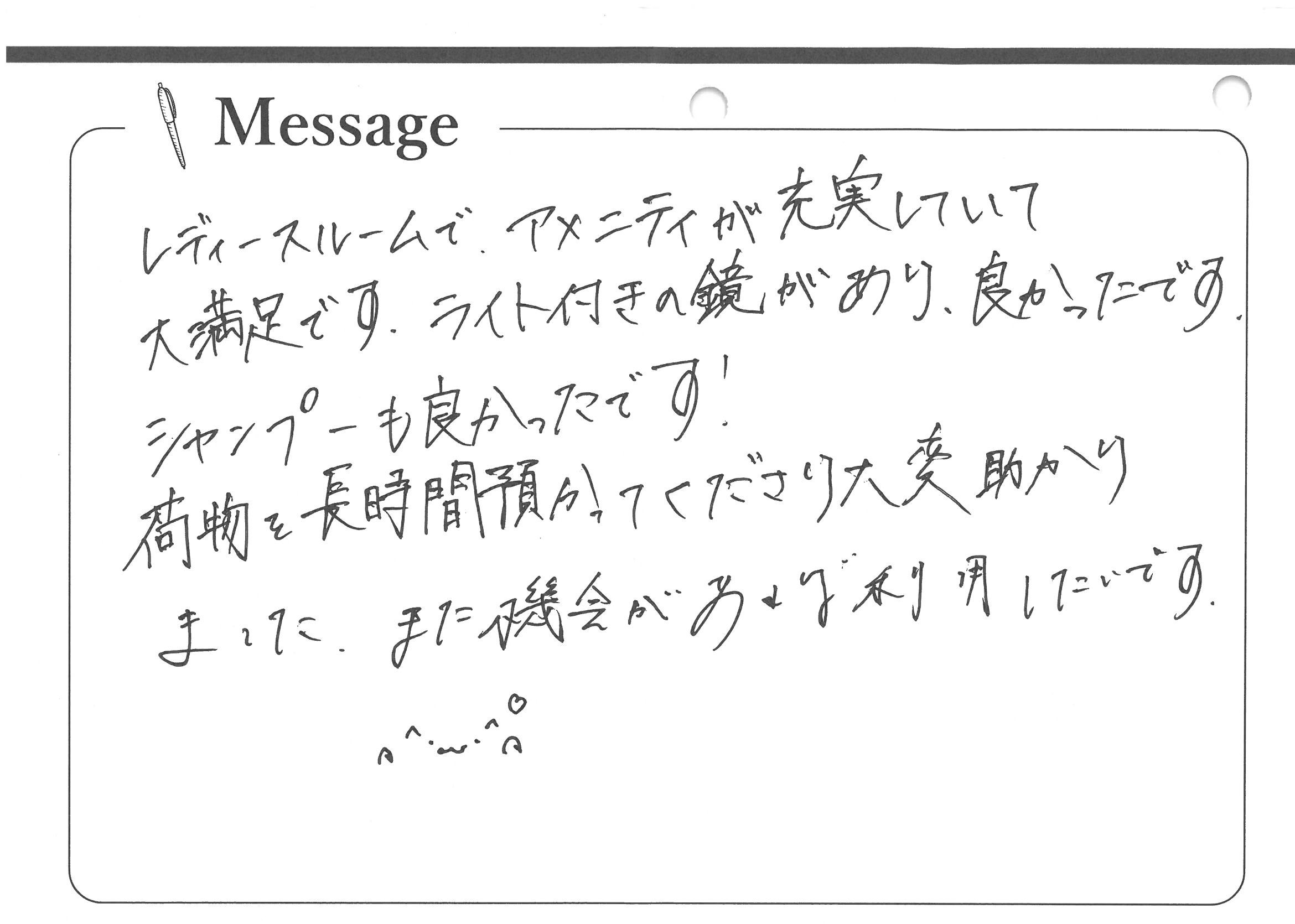 レディースルームでアメニティが充実していて大満足です。ライト付きの鏡があり、良かったです。シャンプーも良かったです!荷物を長時間預かってくださり大変助かりました。また機会があれば利用したいです。