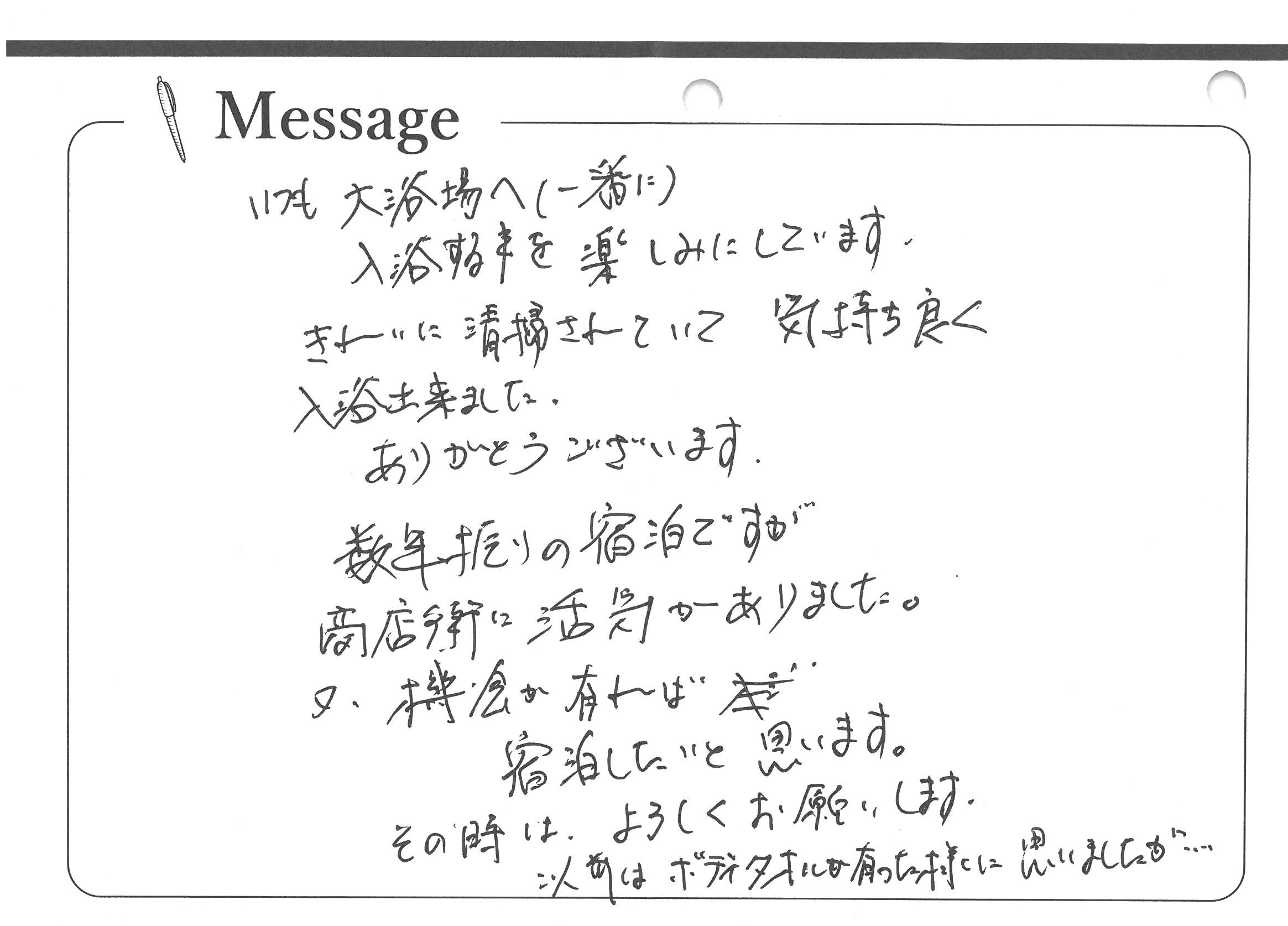 いつも大浴場へ(一番に)入浴する事を楽しみにしています。きれいに清掃されていて気持ち良く入浴出来ました。ありがとうございます。数年振りの宿泊ですが商店街に活気がありました。又、機会が有れば宿泊したいと思います。その時は、よろしくお願いします。
