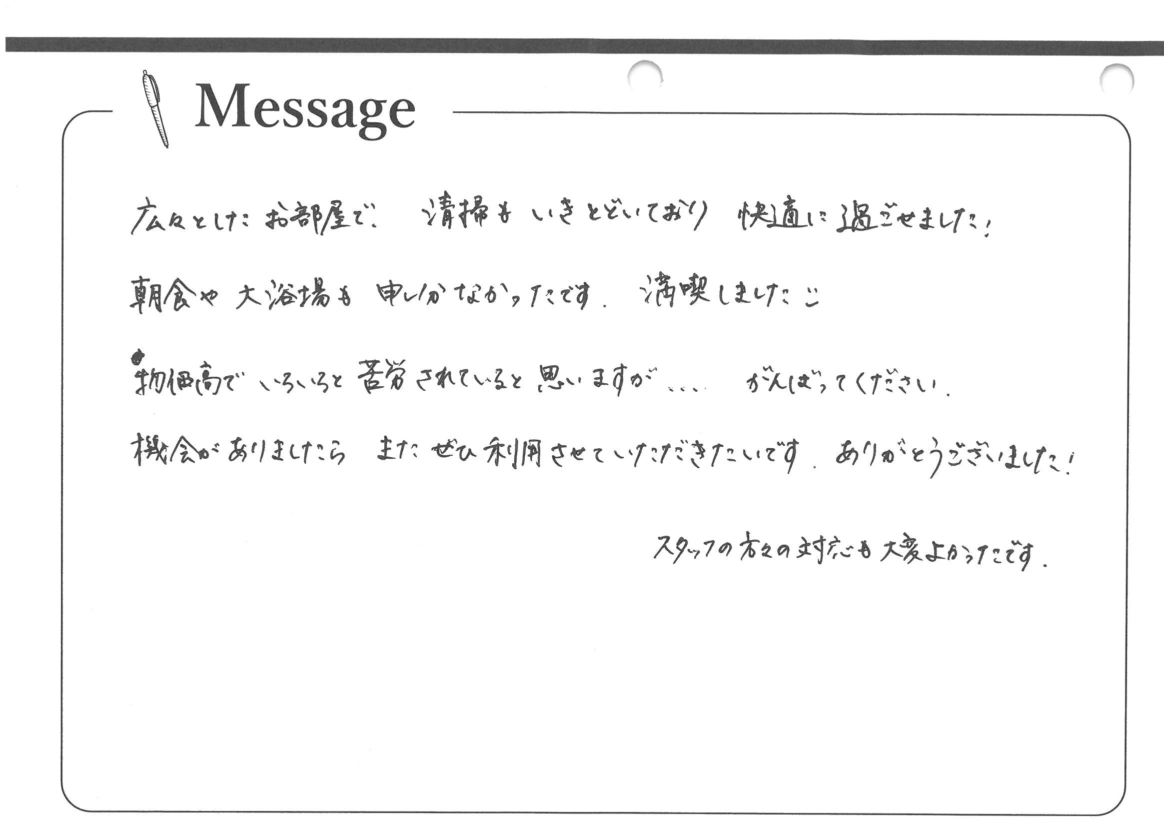 広々としたお部屋で清掃もいきとどいており快適に過ごせました!朝や大浴場も申し分なかったです。満喫しました。物価高でいろいろと苦労されていると思いますが・・・がんばってください。機会がありましたら、またぜひ利用させていただきたいです。ありがとうございました!スタッフの方々の対応も大変よかったです。
