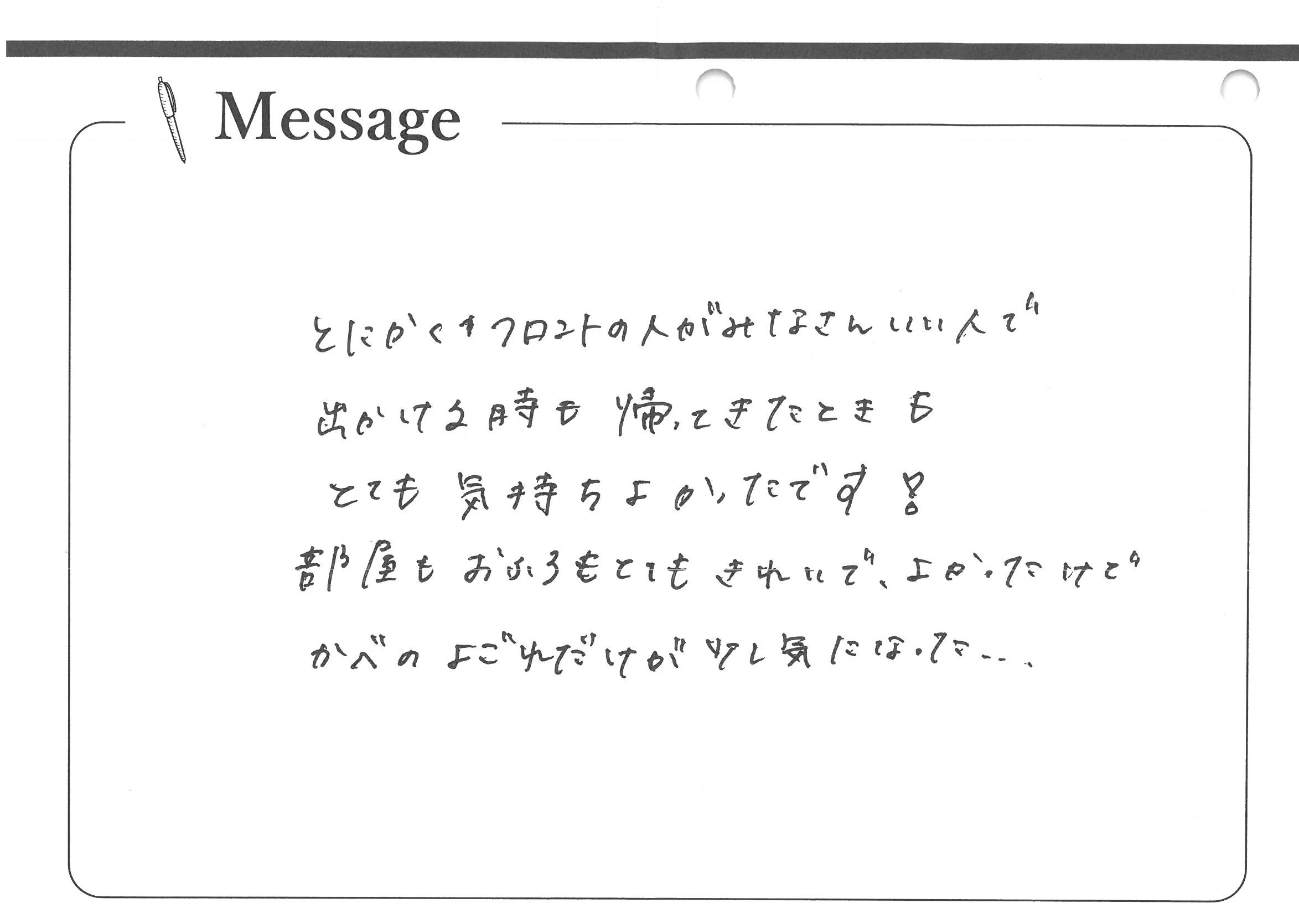 とにかくフロントの人がみなさんいい人で出かけるときも帰ってきたときもとても気持ちよかったです!部屋もおふろもとてもきれいでよかったけど、かべのよごれだけが少し気になった・・・。