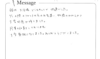 沖縄から新婚旅行で来ました。道路(景色)がすごくキレイで人も優しくすごく良いなと思いました。フロントの方々もすごく丁寧でした。ホテルについてゆっくり説明してくれたのよかった!!(男性)また旅行の機会があればまた利用したいです。ありがとうございました。またくるサ~。自転車やLOOP?がすごく多かった。...